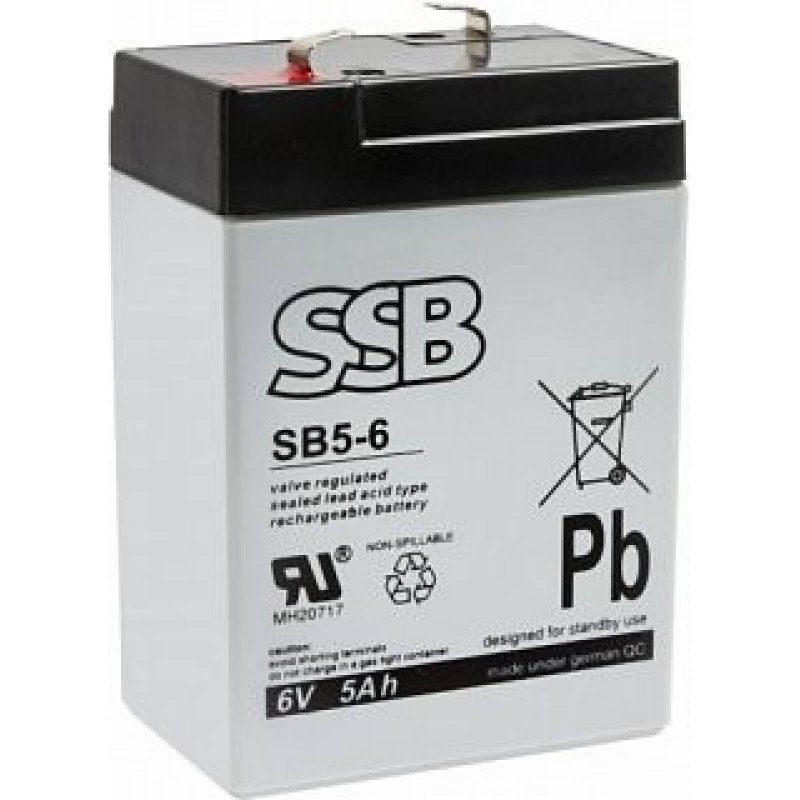 SSB SB 5-6 - obľúbený, bezúdržbový olovený akumulátor s kapacitou 5 Ah. Bol vyrobený technológiou AGM [Absorbent Glass Mat], ktorá sa používa v cyklických a vyrovnávacích batériách. Vďaka špeciálnej konštrukcii krytu je tesný, neuvoľňuje žiadne plyny a môže pracovať v akejkoľvek polohe. Jeho najčastejším pracoviskom sú prenosné zariadenia, baterky a nízkoenergetické UPS. Projektovaná životnosť SB 5-6 je 5 rokov pre prevádzku pri teplote 20-25°C.